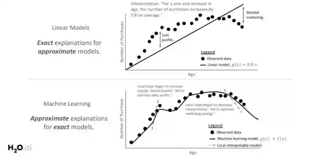 Patrick Hall的以下幻灯片说明了为什么在需要清晰简单的模型解释时,通常首选白盒模型(具有线性和单调函数)。 最上面的图表显示,随着年龄的增长,购买数量会增加。 在全局范围内响应函数具有线性和单调关系,这容易被所有利益相关者理解。