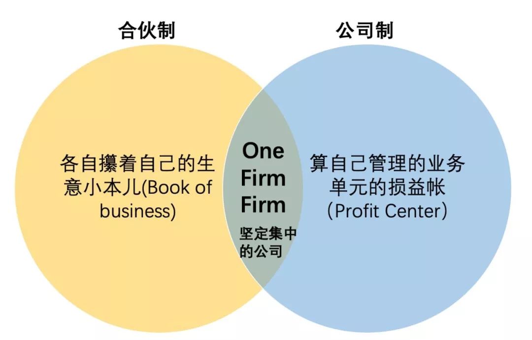 专业服务组织从其诞生开始就是以“合伙制”形式出现(顺便提下,现在国内企业界说的“合伙人制度”,大多数情况下都是指股权和分红激励模式,和合伙制的合伙人是两回事)。法律上,合作制这种组织形态的本质是“人合”,即组织成员之间的信任和合作关系,所有合伙人对公司经营过程中的债务承担无限连带责任,一损俱损、一荣俱荣。只有理念相同、互相信任的合伙人,方能走到一起,这从机制上确保了组织的凝聚力和使命感;同时,这种制度也限制了合伙制公司不能像股份公司或有限责任公司那样,能大量吸收新成员来扩张规模。