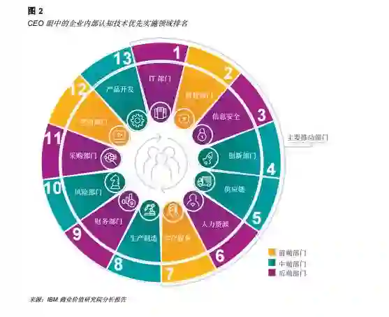 为全面审视各业务职能部门的投资优先顺序,我们根据受访 CEO 提出的在企业内部各个部门应用认知技术的优先顺序(要么按最高预期投资回报原则,要么出于某种战略考虑),运用调研数据确定了各个职能部门的先后排名。受访 CEO 根据推动认知技术采用的能力对各职能部门进行了排名,并将可能由此开始实现认知技术价值的部门作为主要推动部门。