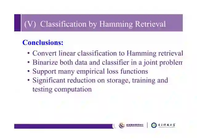 总结起来,我们将线性分类问题转化成了汉明检索问题,把数据和分类器同时进行二值化处理,它也支持很多empirical loss函数,并且有效减小存储和训练测试消耗资源。