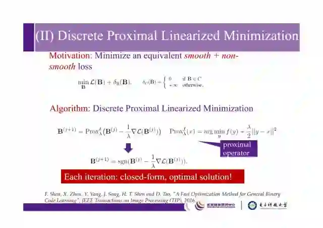 这是我们在TIP2016做的一个工作,我们的方法被证明一定是能够收敛的,也通过实验证明了这个方法比relaxed方法好很多。如果B属于C,则损失是0,否则损失为正无穷,也就是将原本问题转化为该问题,就是smooth+non-smooth loss 问题,通过这个方法可以快速得到。该方法和SD方法区别在于,SDH需要逐比特地学,而这个方法可以学整个B。