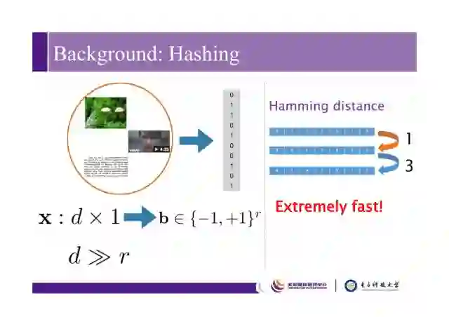 针对图像、视频或者文本数据库,哈希的主要工作是将高维数据变成低维紧凑的二值码,比如将d维数据变成r维,d远远大于r,一般r维数据在几十比特到几百比特之间。将数据变成哈希码后计算数据之间的距离或相似性会非常快,常用汉明距离来衡量,汉明距离的计算可以用CPU的一些快速指令,比如XNOR(异或非)或POPCOUNT。