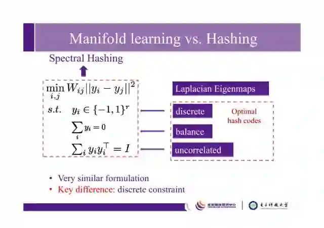 第一个条件保证所学哈希码的离散性,第二个条件保证学习出来的哈希码是平衡的,第三个条件保证学习到的哈希码是不相关的,以此可以学到更有效的紧凑的哈希码。从形式上看,哈希和流形学习之间的区别很小,主要在如上三个限制条件上。但其中最主要的,离散条件(二值化)的限制使得哈希学习的研究和传统的流形学习方法或其他降维方法产生很大区别,主要体现在优化上面。