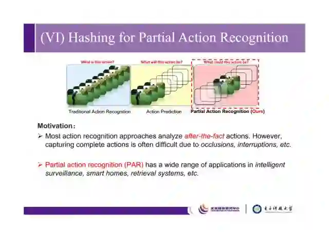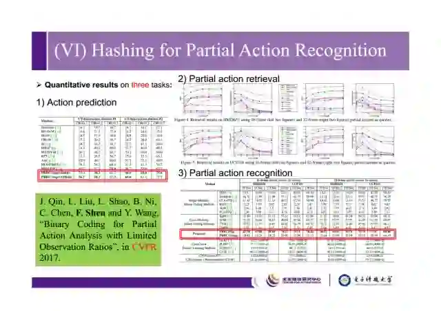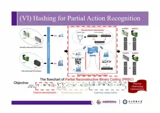 最后讲一下我们在CVPR2017上用哈希去做partial action recognition的工作,传统方法是通过视频序列判断动作,action prediction是通过前序帧来预测后序帧。我们partial action recogtion在丢帧、遮挡的情况下依旧能够预测动作。