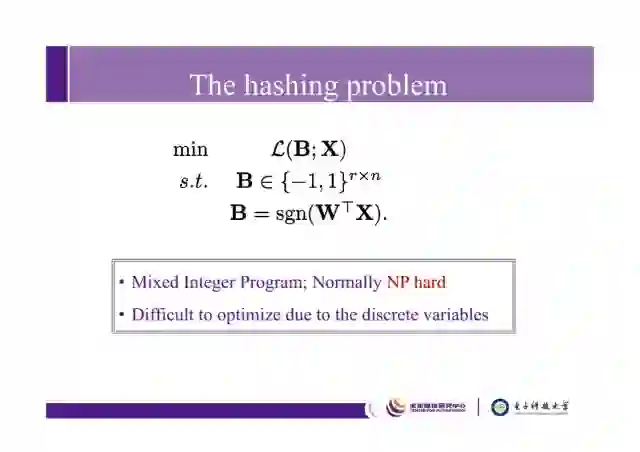 所谓哈希学习问题只指,对于数据X,我们期望学到它的紧致表达哈希码B(r比特),B是r×n的,同时期望学习到一个预测函数(哈希函数)。因为变量B是离散的,所以不能用传统的梯度下降方法去解,这一问题是典型的混合整数问题,通常为NP hard(non-deterministic polynomial,缩写NP,非确定性多项式)问题。