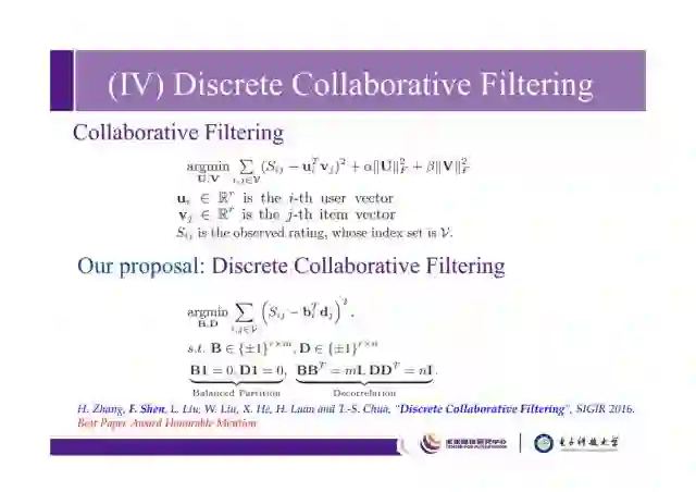 这是我们2016SIGIR上和新加坡国立大学张含望老师合作的一个工作。Collaborative filtering,大家知道协同滤波一般用在推荐系统里,它实际是一个矩阵分解问题。一般推荐系统中用户量和数据量是非常大的,当时我们希望通过二值哈希技术来将它加速。