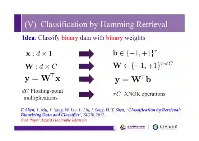 这里的思想非常简单,一句话称之为“classify binary data with binary weights”,之后用二进制码进行分类,比如从d维变成r维,分类器W是d×C维的,把他变成r×C维的二进制,将得分y也变成二值的。很显然的好处是,左边需要dC次浮点数乘积操作,右边需要rC次XNOR操作,速度比左边快很多。这个工作是我们组和北大、腾讯AI Lab以及英国的东英吉利亚大学合作的。