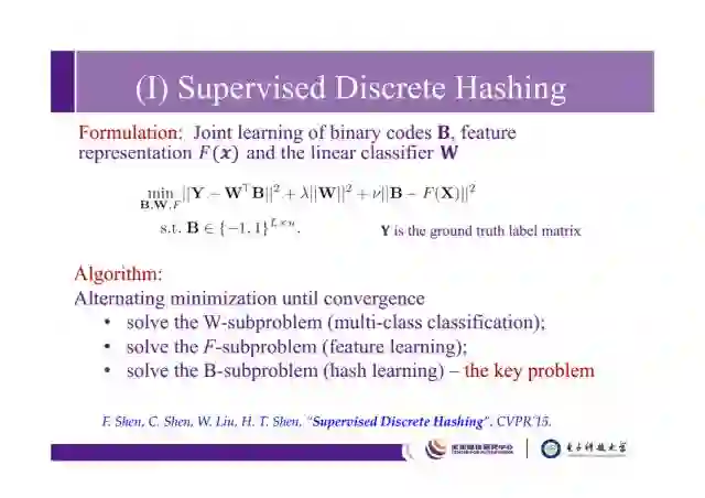 这是我们在CVPR2015的一个有监督的离散哈希工作。假设有一个数据X,我们希望学习到它的二进制代码B,同时使其很容易被分类到Y(groundtruth)这个标签矩阵上,希望通过W这个矩阵将B很容易分到正确的类别上。这里面有三个变量B,W,F