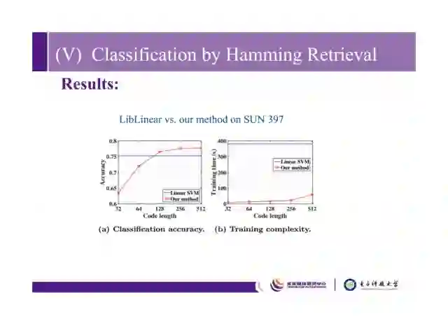 这是在SUN397数据集上的结果,可以看出当哈希码的长度超过128比特时,我们的算法准确率超过linear SVM,训练时间比linear SVM少很多。