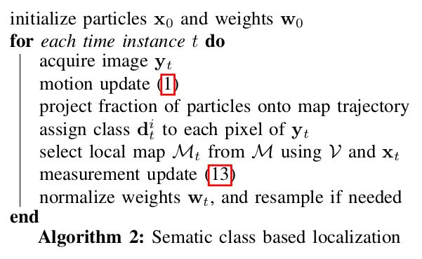 语义的观测模型的意义在于通过位姿的调整使得图像中像素点类别和对应的地图点类别尽可能多的一致。在定义了运动模型和观测模型后,利用粒子滤波实现定位。