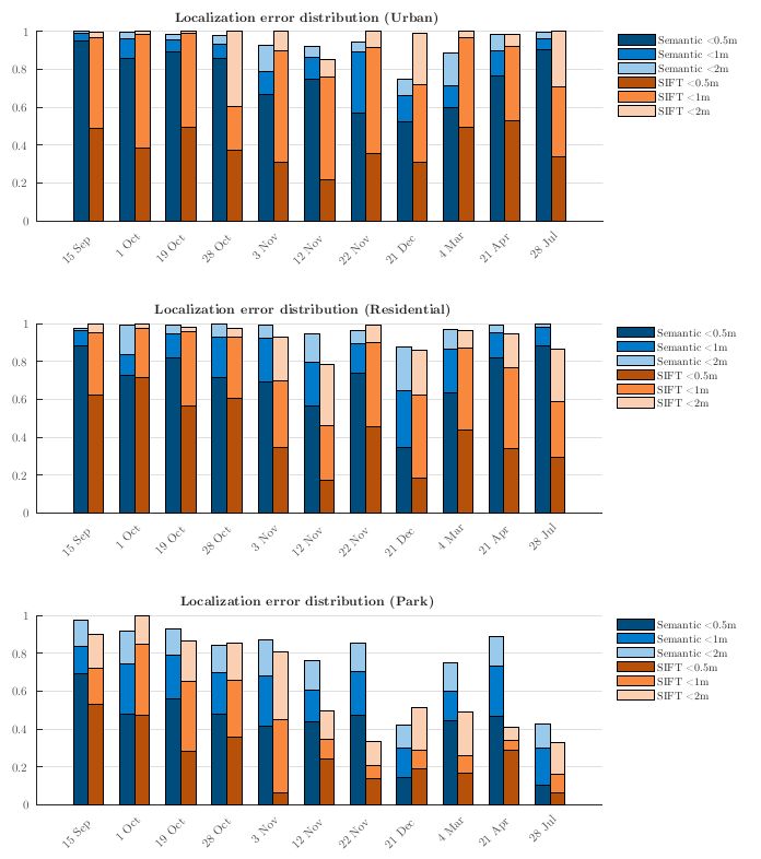 2、本文提出的语义定位方法具有更高的长期定位精度。如下图所示, 柱状图中的每根柱子表示对应时间下11次运行的误差。越高的柱子意味着更多的样本在标注的误差范围内被成功地定位,因此定位效果更好。