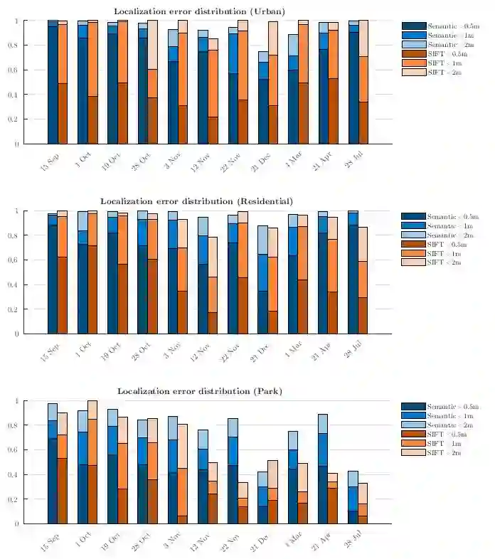 鲁棒的跨季节定位是自动驾驶长期视觉导航的重要挑战之一。在本文中,我们利用图像语义分割(每个像素被赋予一个它所属物体类别的标签)的最新进展来解决长期视觉定位问题。我们表明,在无需使用具体的特征描述子(SIFT、SURF等)的情况下,语义标记的三维环境地图以及语义分割的图像可以有效地用于车辆定位。因此,我们不依赖手工制作的特征描述子,而是依赖于图像分割器的训练。本文方法生成的地图与基于传统描述子的方法相比节省了大量的存储空间。基于粒子滤波的语义定位方案与基于SIFT特征的定位方案相比,即使在一年中季节性变化较大的情况下,我们也能与更大、更具描述性的SIFT特征相媲美,并且大多数情况下能够在低于1 m的误差下进行定位。