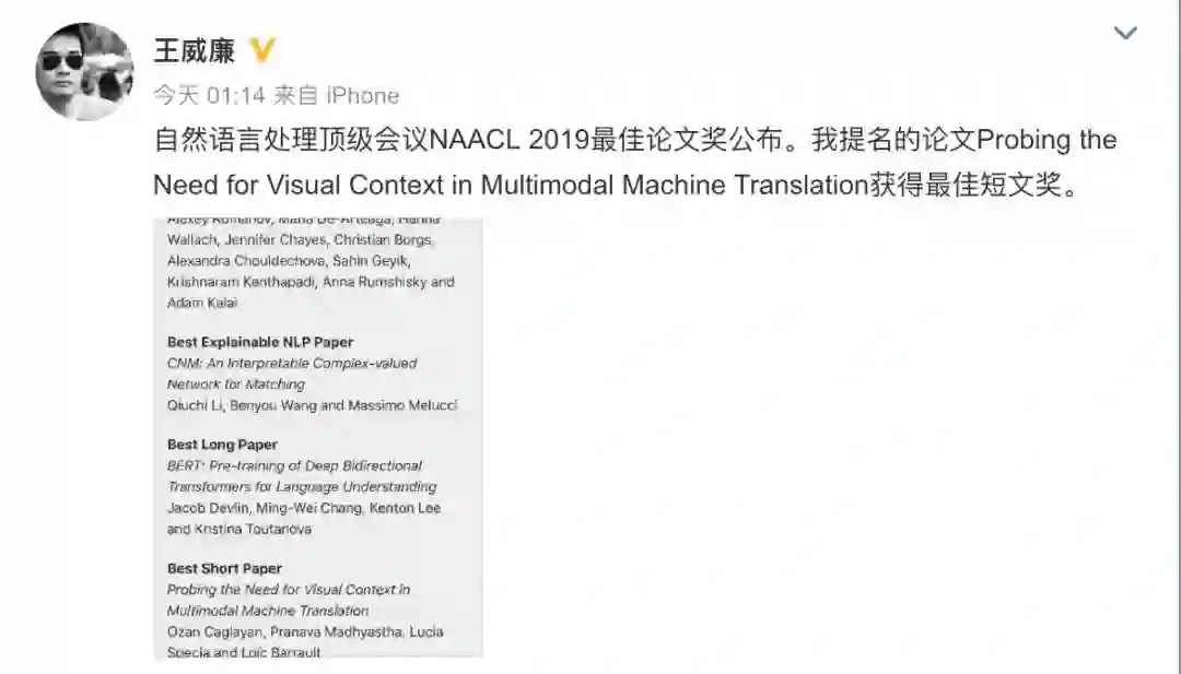 同时,NLP 领域的华人新星王威廉提名的论文获得最佳短文奖。