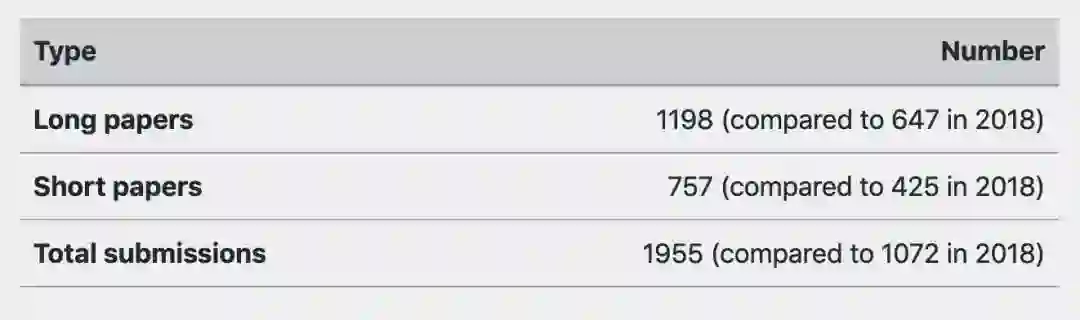 据官方统计,此次 NAACL 2019 共收到论文 1955 篇论文,共接收论文 424 篇,录取率仅为 22.6%。其中收到长论文投稿 1198 篇,短论文 757 篇。