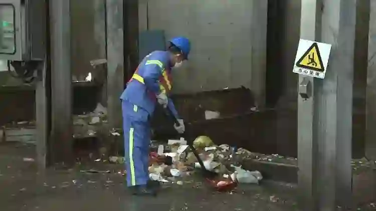 市民分好垃圾后,干湿垃圾会分别由干湿垃圾车运送至垃圾中转基地,在这里,工作人员会对垃圾进行最后的检查,然后分干湿推入指定的卸料池中。