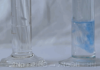 金属钠与水的反应并不都是“浮熔游响红”,我们也可以给它变点花样。这里上层的液体是煤油,下层是水。金属钠与煤油不反应,并在其中下沉,接触到水层之后引发反应。反应生成的气泡推动小钠块上浮,接下来,继续下沉-反应-上浮-再下沉的循环。水溶液的颜色来自酸碱指示剂与反应生成的碱,粉红色的一边加入了酚酞,蓝色的一边加入了百里酚酞。