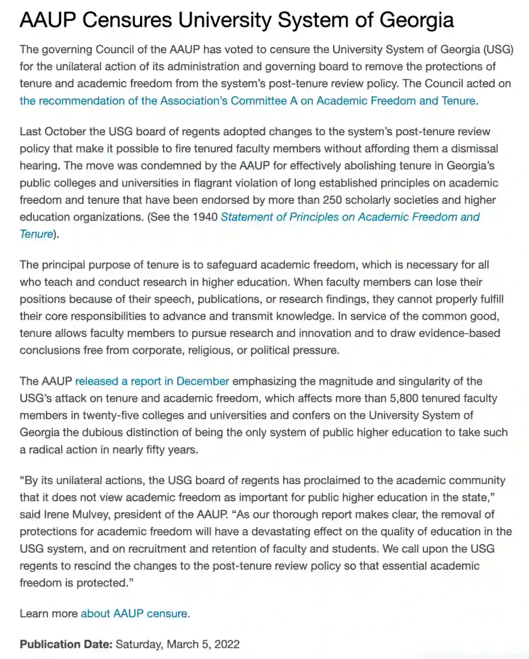 来源:https://www.aaup.org/news/aaup-censures-university-system-georgia