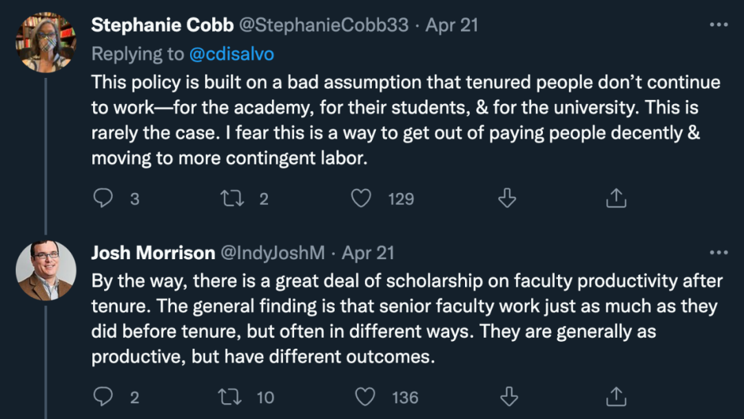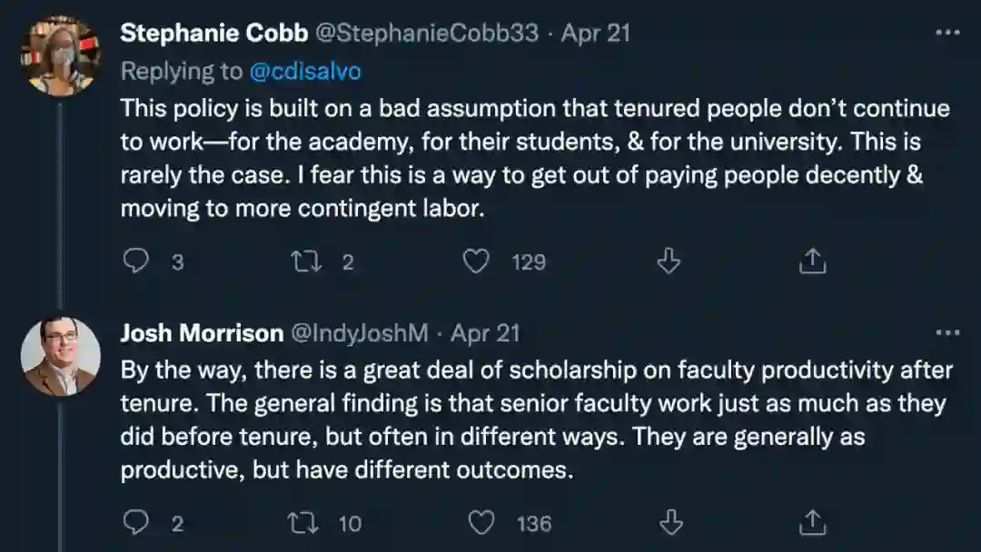 有人表示,这项政策建立在了一个错误的假设之上,即终身职位的人不会继续为学院、学生和大学工作,其实这种情况很少见。