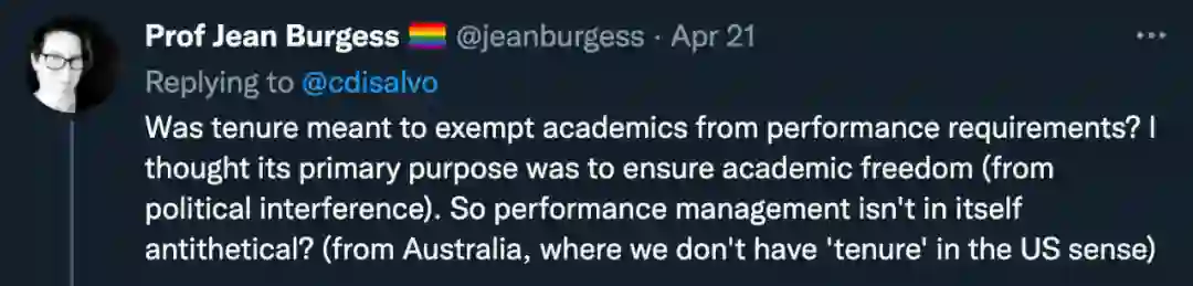 「终身教职是为了免除学者的绩效要求吗?我认为它的主要目的是确保学术自由(不受政治干预),所以这样的绩效考核不是自相矛盾的吗?」