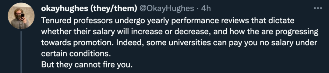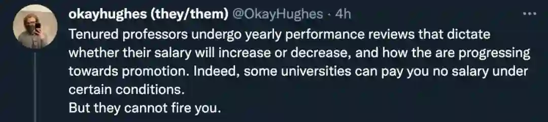 「终身教授每年都会进行绩效评估,以决定他们的薪水是增加还是减少,以及如何晋升。确实有些大学某些情况下可以不付薪水,但是它们不能解雇你。」