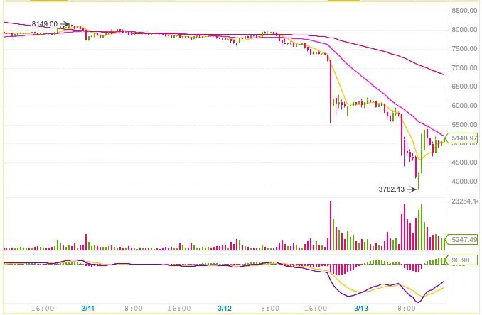 3 月 12 日下午 6 点半开始,比特币从 7211 美元闪跌至 5555.55 美元。今天早上比特币价格再次跳水,半小时再次狂泻近 2000 美元,最低跌至 3782.13 美元,24 小时跌幅超 40%。合约帝数据显示,仅火币、OKEx、币安、BitMEX 四家交易所的单日爆仓量 31.33 亿美元,达到了有史以来的单日最高。爆仓人数超 11 万,也是爆仓人数单日最高。