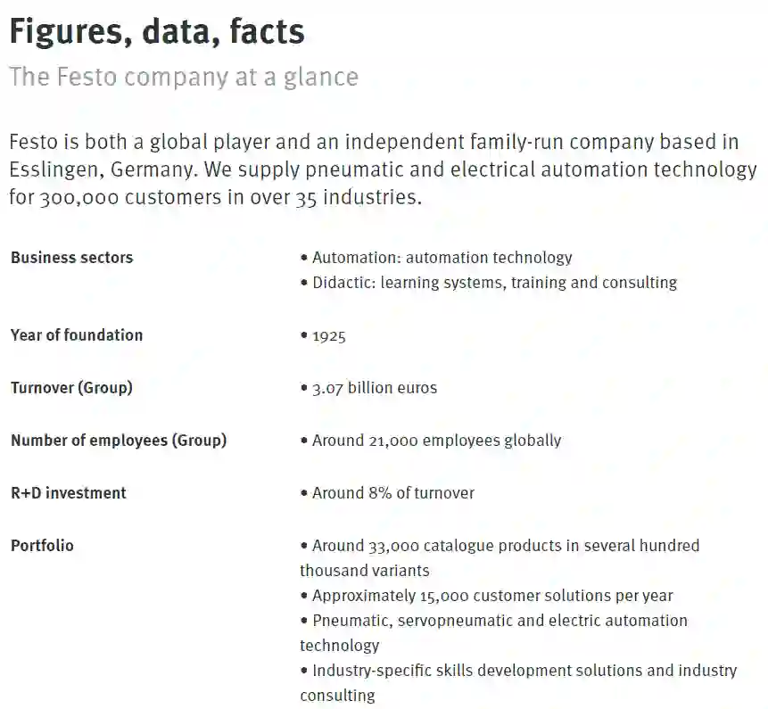 经过将近一个世纪的积累,Festo 已经成长为最著名的气动元件、组件和系统生产厂商,为超过 35 个行业的 30 万客户提供气动和电气自动化技术。此外,它还拥有了足够强大的现金流(营业额达 30 多亿欧元),几乎不受资本市场的影响。