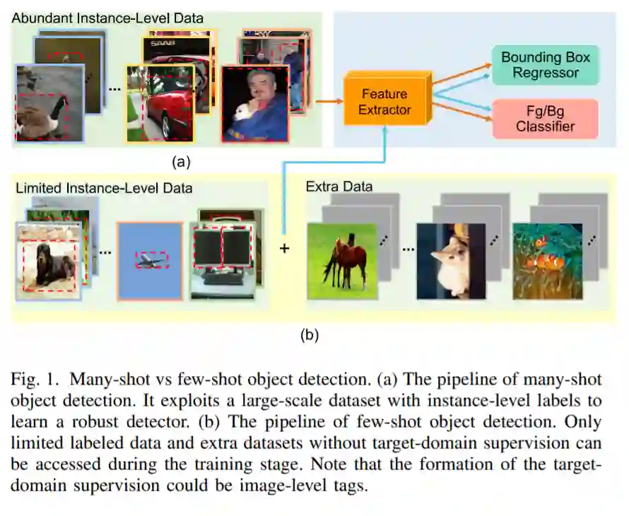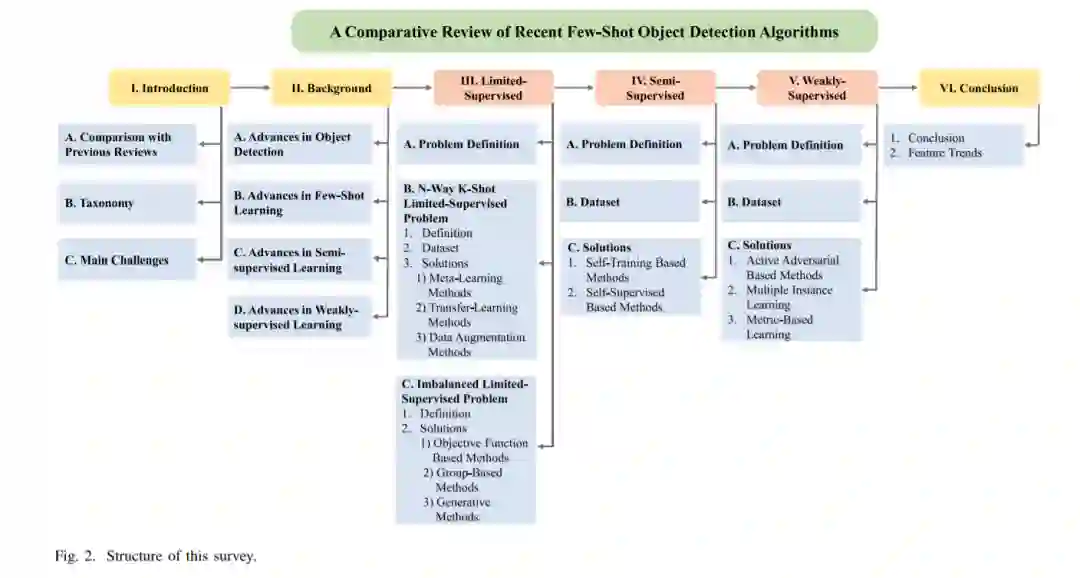 在这里,我们将本文的范围限制在如何在少样本/有限监督设置下学习一个合格的检测器。为了内容的完整性,我们还简要回顾了目标检测、少样本学习、半监督学习和弱监督学习的进展。主要贡献总结如下: