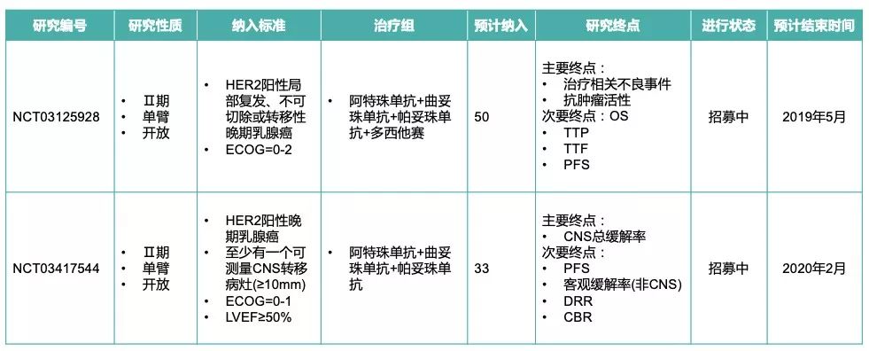 表1 正在进行的atezolizumab+曲妥珠单抗/帕妥珠单抗的研究