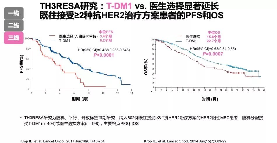 目前关于HER2阳性MBC的三线或以上治疗尚未标准方案。EGF104900研究证实,曲妥珠单抗治疗疾病进展后,持续使用曲妥珠单抗显著延长PFS和OS。TH3RESA研究证实,T-DM1相比于医生选择的方案,显著延长既往接受≥2种抗HER2治疗方案患者的PFS和OS(图3)。