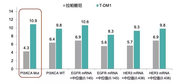 CLEOPATRA研究回顾性分析显示,肿瘤浸润淋巴细胞(TIL)>20%的患者接受帕妥珠单抗治疗的HER2+患者生存状况最佳(图9);EMILIA研究显示,T-DM1对PIK3CA突变的HER2阳性MBC治疗预后更好(图10),PIK3CA突变的患者对T-DM1敏感,而对拉帕替尼不敏感,T-DM1对PIK3CA突变的HER2阳性MBC治疗预后更好,且无论EGFR和HER3 mRNA表达惠普如何,T-DM1治疗HER2阳性MBC的PFS较拉帕替尼延长。
