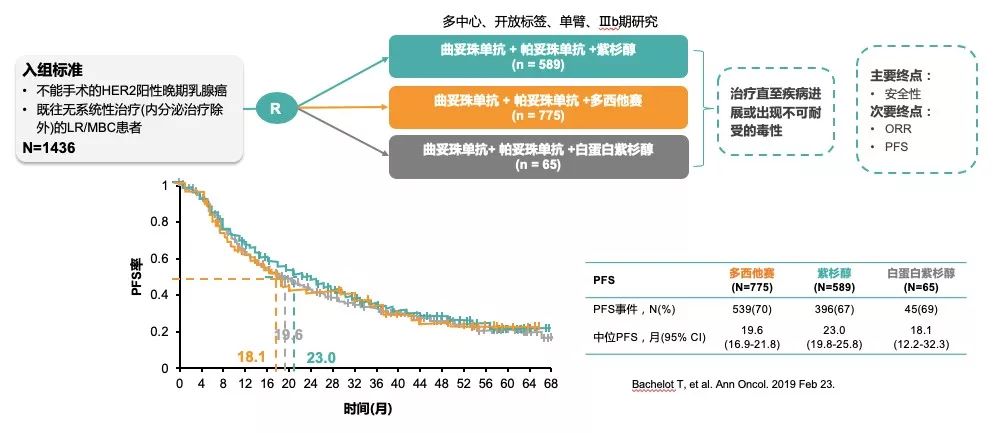 3. 联合不同化疗:PERUSE研究入组既往无系统性治疗且不能手术的HER2阳性局部晚期或晚期乳腺癌患者,对比曲妥珠单抗+帕妥珠单抗双靶方案联合紫杉醇、多西他赛和白蛋白结合型紫杉醇的疗效。结果显示三组患者中位PFS分别为23个月、19.6个月和18.1个月,无统计学差异(图7)。PERUSE研究证实,对于复发患者既往一线化疗方案,选择妥妥双靶联合不同化疗药物,适应不同患者用药需求。