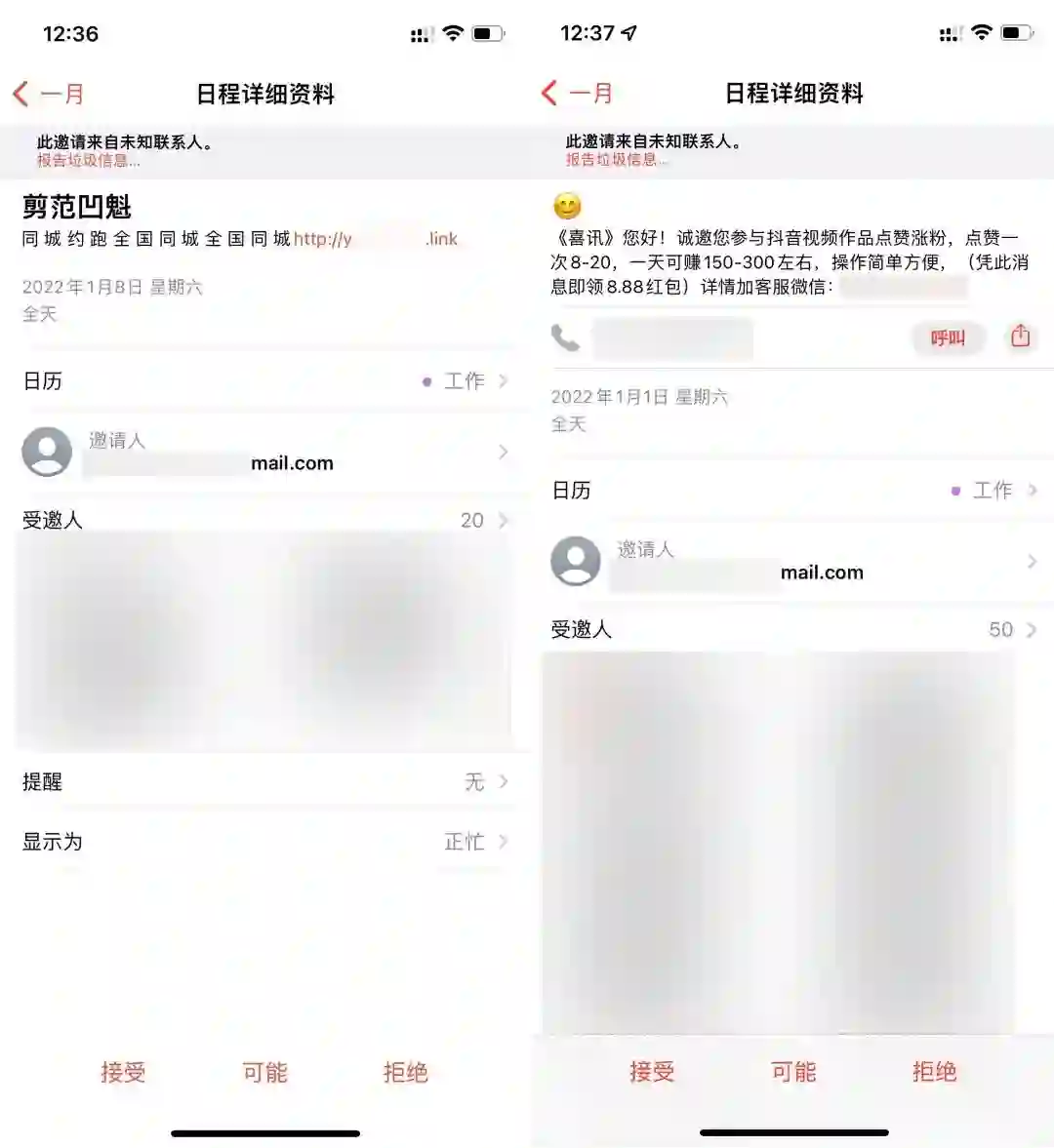 除了无孔不入、惹人烦躁之外,家庭 app、共享相簿和日历骚扰信息的杀伤力实际上藏在文字内容背后。用户在收到此类垃圾信息的时候,往往会下意识地点击“拒绝”——此举正中不法分子下怀。