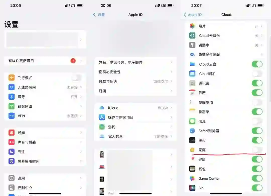 如果你也受到这些消息的困扰,可以考虑用这个方式进行处理:进入“设置 > 你的 Apple ID > iCloud”,关闭“家庭”、“日历”、“iCloud 照片”的功能。或者你可以再进一步,卸载“家庭”app。