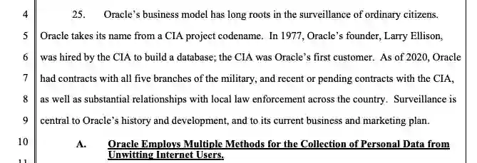 诉讼材料中,ICCL 还指出,甲骨文的商业模式涉及公民安全,Oracle 这个名字其实源自 1977 年美国中央情报局(CIA)的一个项目代号,而且 CIA 也成为后来甲骨文公司的首位客户。