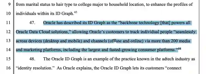 根据诉讼文本,甲骨文旗下 BlueKai 数据管理平台,包含的 ID Graph 工具可帮助营销人员“将不同营销渠道和设备身份与一个客户联系起来”,具有“识别互联网用户,并具有将数据匹配到个人的能力,包括甲骨文定义的所谓‘匿名’数据。”
