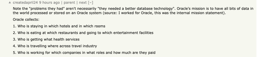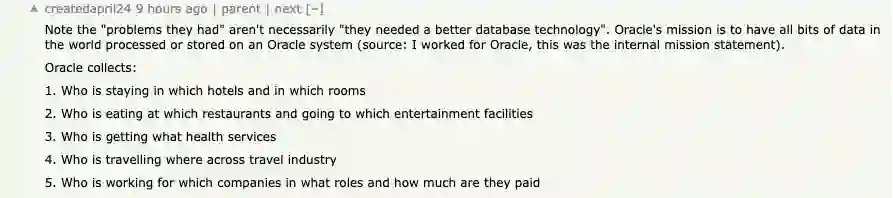 对此,也有前甲骨文员工在 Hacker News 上评论道,“CIA 遇到的问题”不一定是“需要更好的数据库技术”,因为 Oracle 的使命是“在 Oracle 系统上处理或存储世界上所有数据以及数据的每一个比特”。