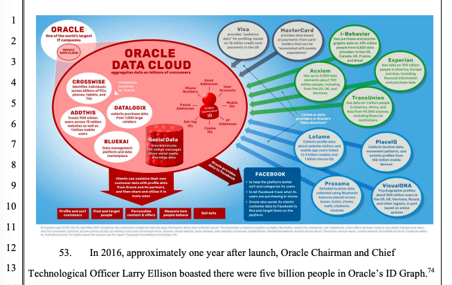在诉讼中,还特地提到“Larry Ellison 表示他们拥有 50 亿人的数据”。并称甲骨文正在运行“全球监控机器” 。更为重要的是,甲骨文在未经用户同意的情况下收集了这些数据,甚至使用代理来绕过隐私控制,并且还将其出售以获取利润。