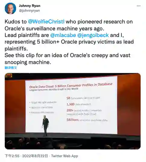 Johnny Ryan 博士引用了 Oracle 首席执行官 Larry Ellison 在 2016 年 OpenWorld 会议上的主题演讲,在此期间 Larry Ellison 吹嘘甲骨文的 ID Graph 中总共有 50 亿人(视频地址:https ://vimeo.com/ 741108673)。