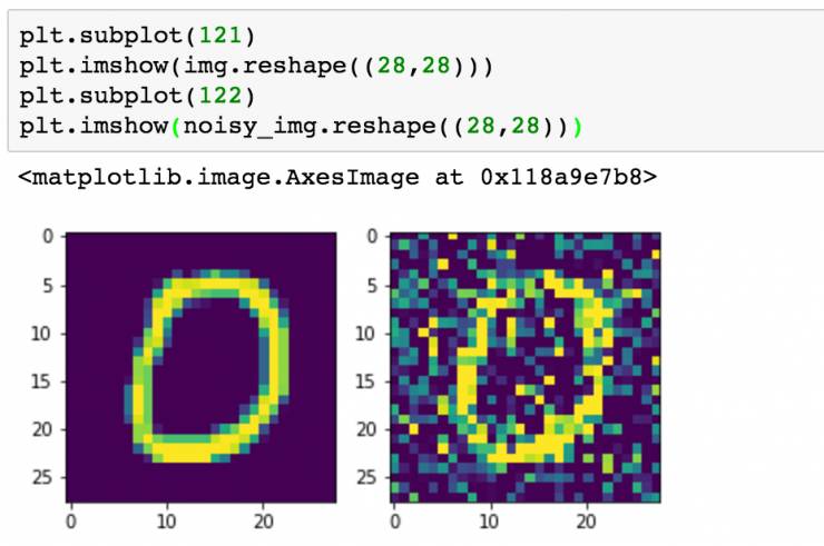 我们通过上面一个简单的例子来看一下如何加入噪声,我们获取一张图片的数据 img(大小为 784),在它的基础上加入噪声因子乘以随机数的结果,就会改变图片上的像素。接着,由于 MNIST 数据的每个像素数据都被处理成了 0-1 之间的数,所以我们通过 numpy.clip 对加入噪声的图片进行 clip 操作,保证每个像素数据还是在 0-1 之间。