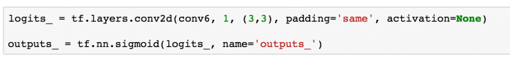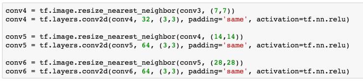 在 TensorFlow 中也封装了对 Upsample 的操作,我们使用 resize_nearest_neighbor 对 Encoder 卷积的结果 resize,进而再进行卷积处理。经过三次 Upsample 的操作,我们得到了 28 x 28 x 64 的数据大小。最后,我们要将这个结果再进行一次卷积,处理成我们原始图像的大小。