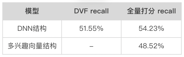 为了高效进行大规模内积近邻检索,现有两段式解决方案的模型结构被限制为用户向量与 item 向量之间直接内积计算的向量结构,而这一要求大幅限制了模型表达能力。而在二向箔算法体系下,模型结构没有任何限制,可以和后链路的点击率、转化率预估等任务用相似的模型。上述结果对比了 DNN 结构和向量结构的离线 recall。其中 DNN 结构为本文采用的模型结构(见第 3.4 节);多兴趣向量结构与DNN结构拥有相同的特征输入,同时采用 transformer 来提取用户的多峰兴趣向量(参考 comiRec[4]),然后多个兴趣向量分别召回 top-1500 再统一排序产出最终 top-1500。由上表可知,去掉向量结构限制后,召回模型的检索精度天花板获得大幅提升,全量打分情况下离线 recall 绝对值提升 5.71%,DNN 结构下二向箔检索的离线 recall 也比向量结构下的全量打分 recall 高 3.03%。