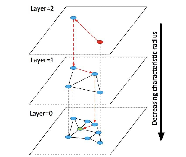 因此,我们的目光转向了对模型和 item embedding 都没有任何约束的图检索。具体来说,我们选用检索精度较高的 HNSW 检索图[11]来根据所有候选项的 embedding 构建索引(构建算法见原始论文)。如下图所示,HNSW 检索图是一个层次化的图检索结构,第0层包含所有节点,上层节点为下层节点的随机采样,每层采样比固定(如32、64);每层都是一个近似 Delaunay 图 [12],图中每个节点都有节点与之相邻,且相邻节点距离相近(如欧式距离)。