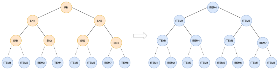 为了使模型训练不再依赖于索引,我们选择在模型训练后再构建没有任何虚拟节点的索引。一种很自然的想法是,将 TDM 树索引构建方式修改为通过层次 k-medoids 聚类的方式构建,其中叶节点依然为所有 item,但中间节点不再是虚拟节点,而是类簇的中心 item。但是,这种索引构建方式要求 item embedding 有层次化的类簇结构,实际上模型在训练时并没有加入相关约束,因此学出的 item embedding 并没有层次化类簇结构。从离线实验结果来看,这种索引构建方案的效果也比较差。