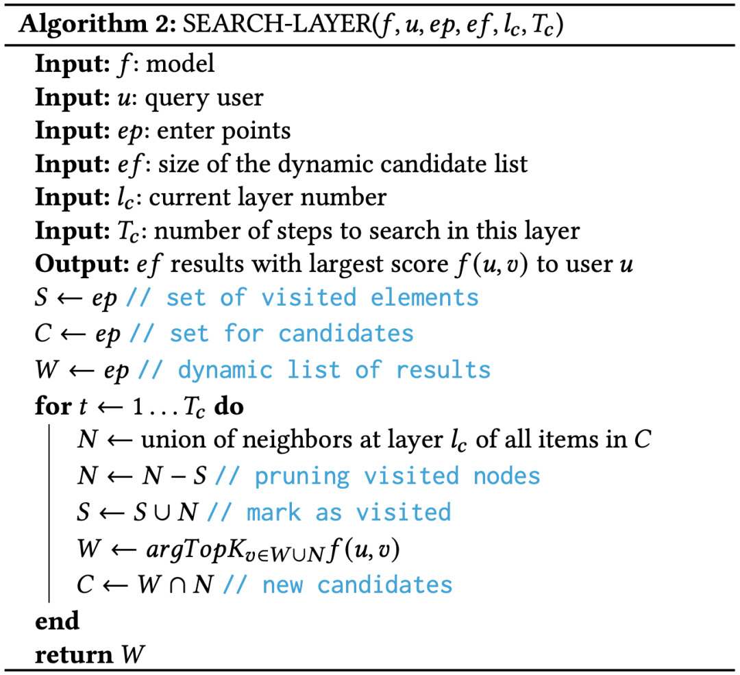 ,从上往下逐层检索(通过 SEARCH-LAYER 函数)得到每层打分最高的候选项