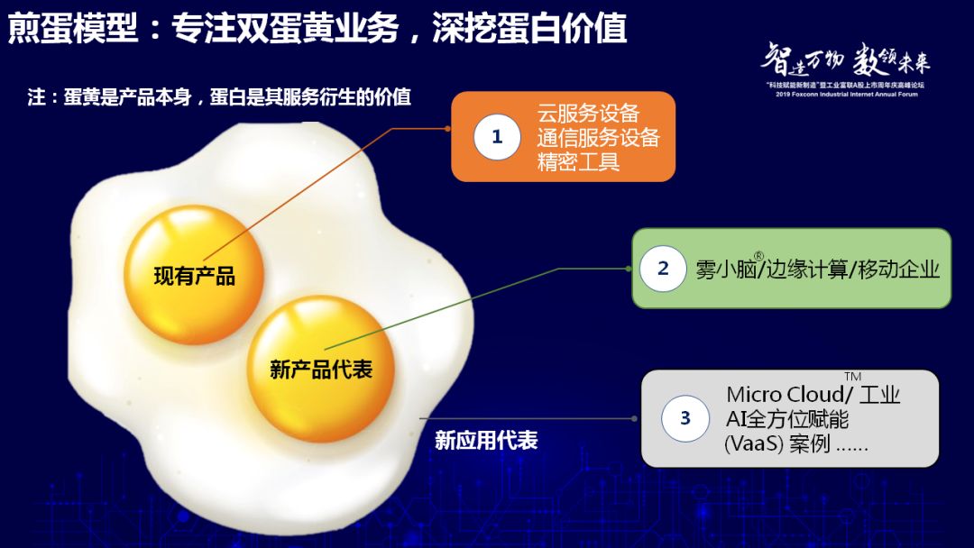 可见,工业富联的蛋黄是核心制造技术、先进制造、5G产品、雾小脑等装备,蛋白是各种应用服务,并致力于将蛋白越做越大,蛋黄越做越多。