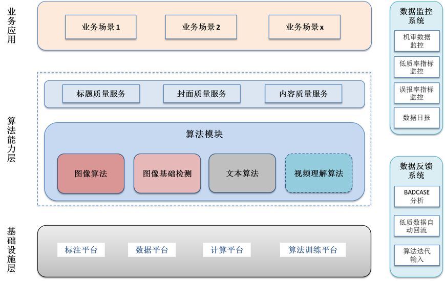 算法能力层:图像算法,图像基础检测,文本算法,视频理解算法以及对外提供的算法服务接口等;