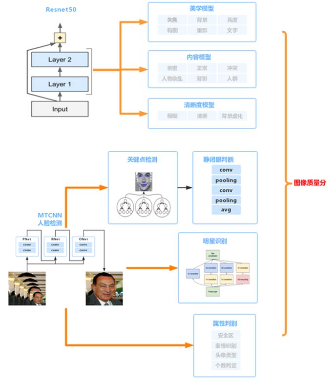 我们的图像综合质量评估主要采用了深度学习模型,构建了美学回归模型(偏重美学指标:失焦,三分构图,主题突出,过曝光 / 过暗等),内容分类模型(侧重⼈物关系、人体等),图像清晰度模型,人脸模型,以及字幕、标题区检测等基于弱监督的多模态模型,最终输出图像综合质量打分。