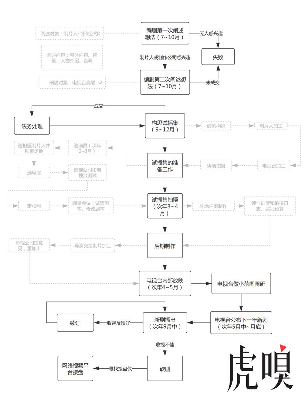 以上流程图由虎嗅绘制,参考资料:影视工业网《美剧“变态”的创作流程 造就了高水准的荧屏盛宴》