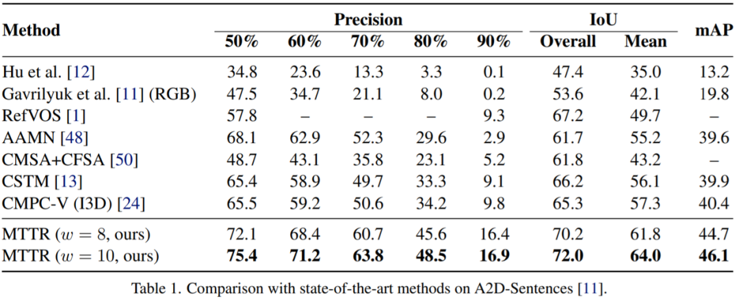 该研究在A2D-Sentences数据集上将MTTR与SOAT方法进行比较。结果如表 1所示,该方法在所有指标上都显着优于所有现有方法。