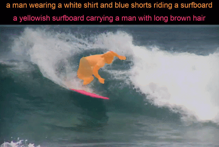研究者还展示了一系列不同对象之间的实际分割效果,如下穿白色T恤和蓝色短裤的冲浪者(淡黄色冲浪板)。